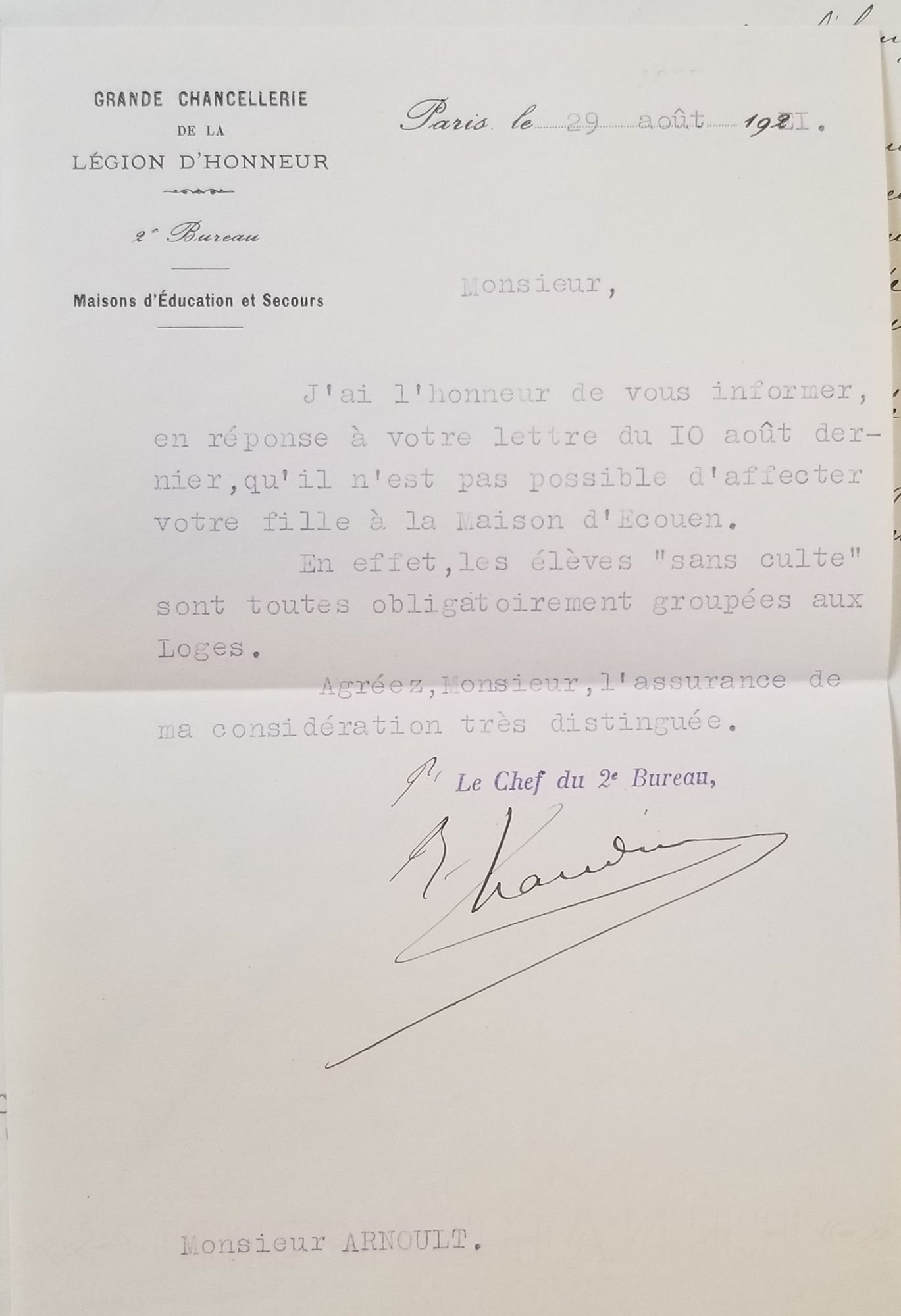 Le 24 mai 1807, Lacépède répond aux directives dictées par Napoléon à Finkenstein. Il y évoque notamment la question des filles de légionnaires protestants. Napoléon lui répondra le 22 octobre, qu’en attendant de savoir s’il désire que l’enseignement soit fait aux deux cultes, l’admission des autres peut être retardée.
