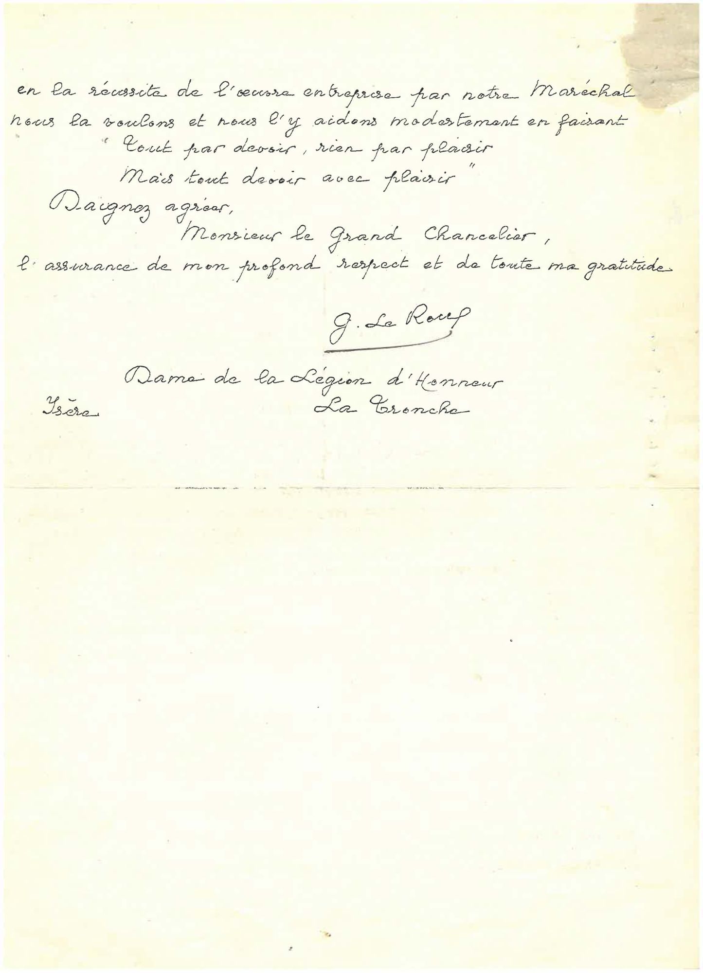 Dans sa lettre de décembre 1940, elle présente ses vœux au grand chancelier et lui confirme son engagement pour les élèves malgré les difficultés du contexte. Le document évoque les heures sombres de l’occupation nazie. Avec la partition de la France en deux zones, il n’est plus possible de faire revenir en zone nord occupée les jeunes filles qui se trouvent avec leur famille en zone sud. Une partie de l’hôpital de La Tronche près de Grenoble est alors affectée aux élèves de la zone sud, auxquelles le grand chancelier rend régulièrement visite. Elle ferme en juin 1945.