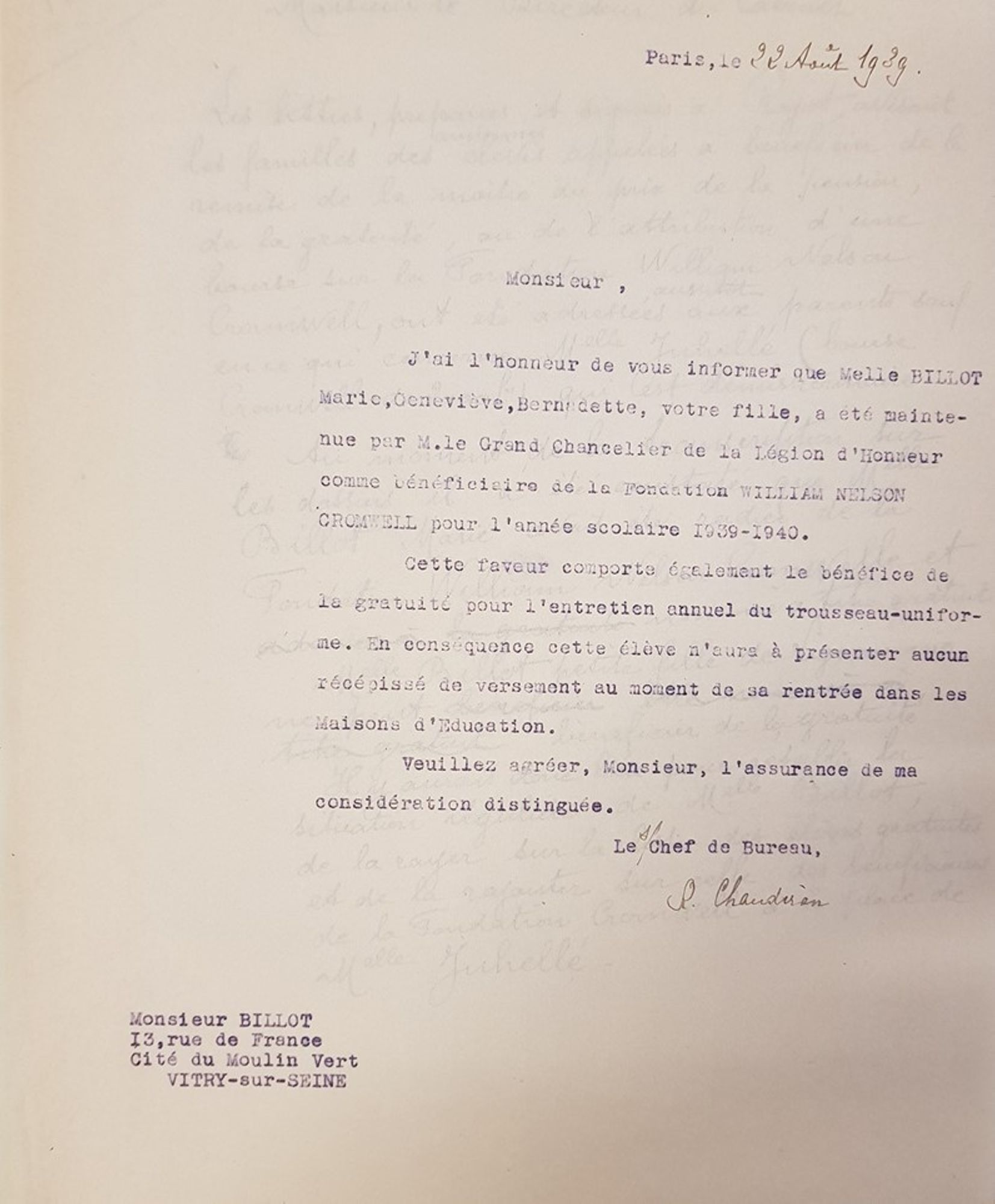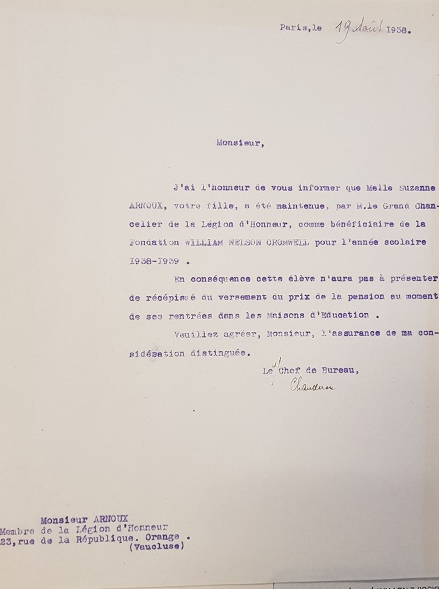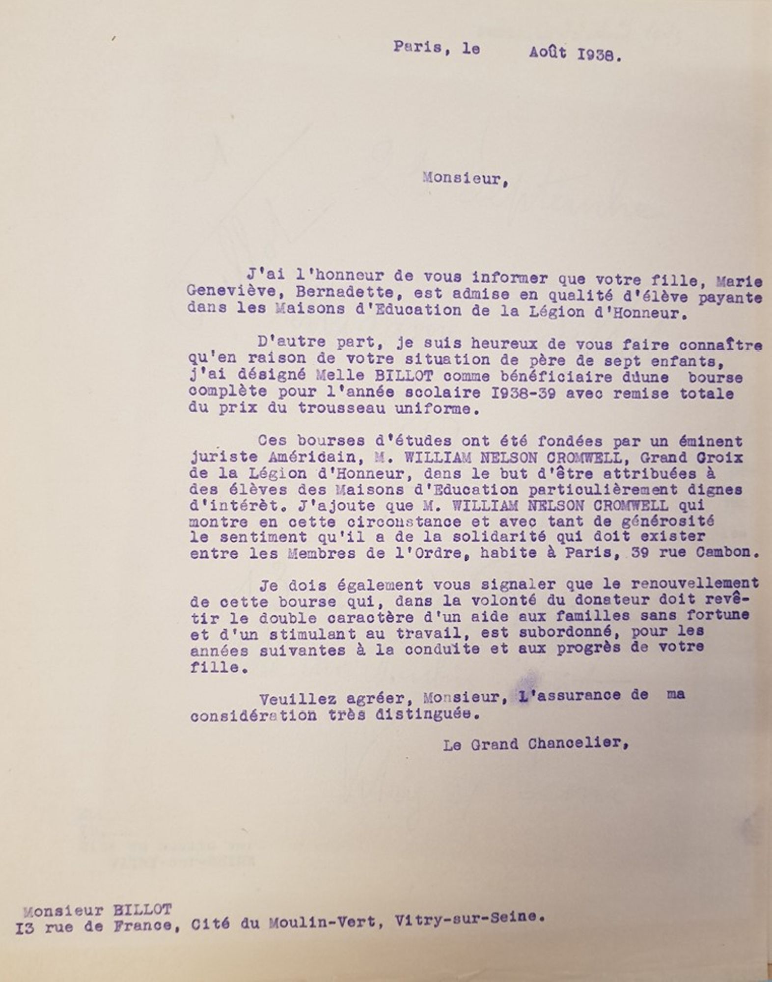 Au cours de l’histoire des maisons d’éducation, plusieurs donateurs ont permis à des jeunes filles d’intégrer notre institution. C’est le cas par exemple de William Nelson Cromwell, avocat américain, grand officier de la Légion d'honneur. Tout au long de sa vie, il s’est acquitté des frais de pension et d’uniforme de nombreuses élèves, facilitant leur scolarité dans les maisons d’éducation comme en attestent ces lettres.