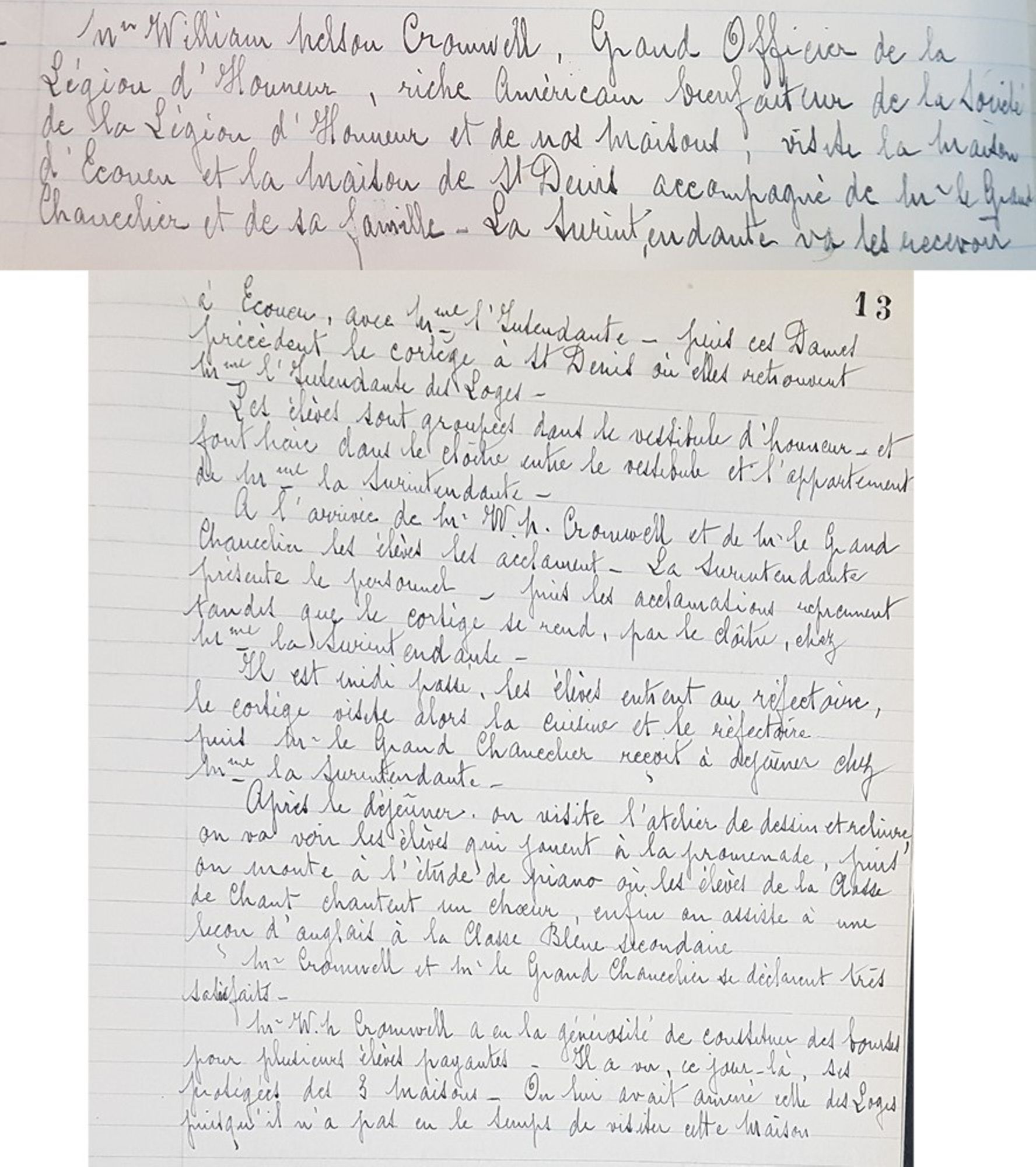 En remerciement de ses dons, William Nelson Cromwell est reçu par le grand chancelier lors d’une cérémonie en janvier 1937 réunissant également la surintendante, l’intendante générale, tout le personnel et les élèves. Le détail de cet événement est soigneusement consigné dans les registres des maisons d’éducation.