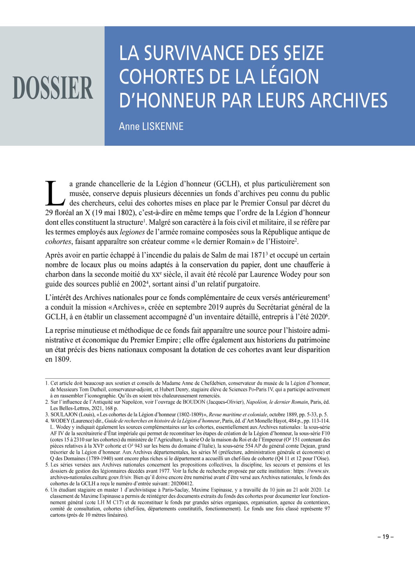 LISKENNE Anne, « La survivance des cohortes de la Légion d’honneur », Bulletin de la Société des amis du musée national de la Légion d’honneur et des ordres de chevalerie, S2, 2021 p. 19-37.