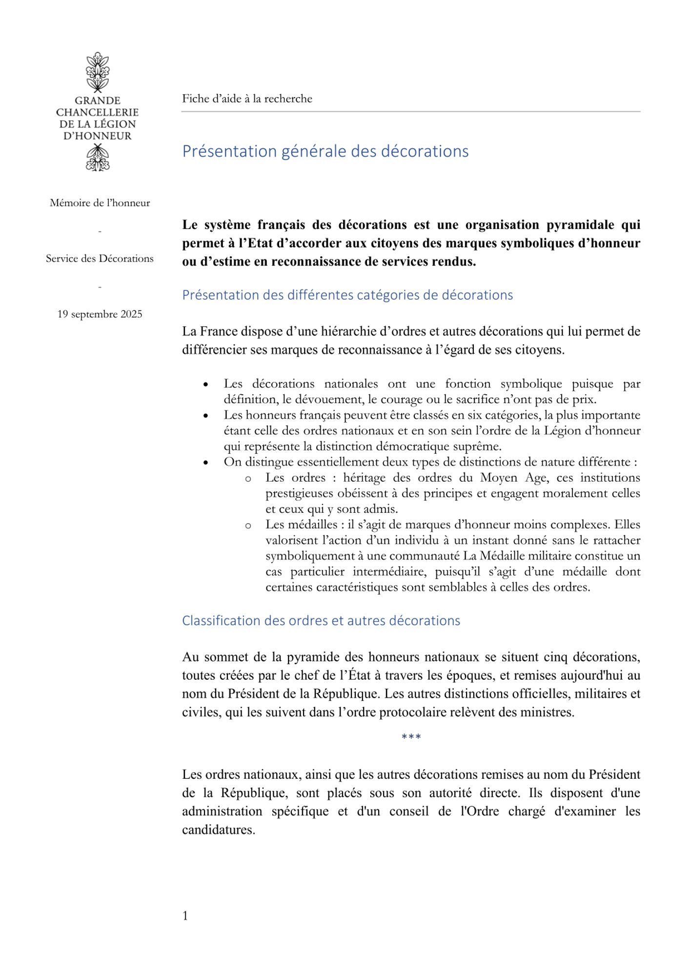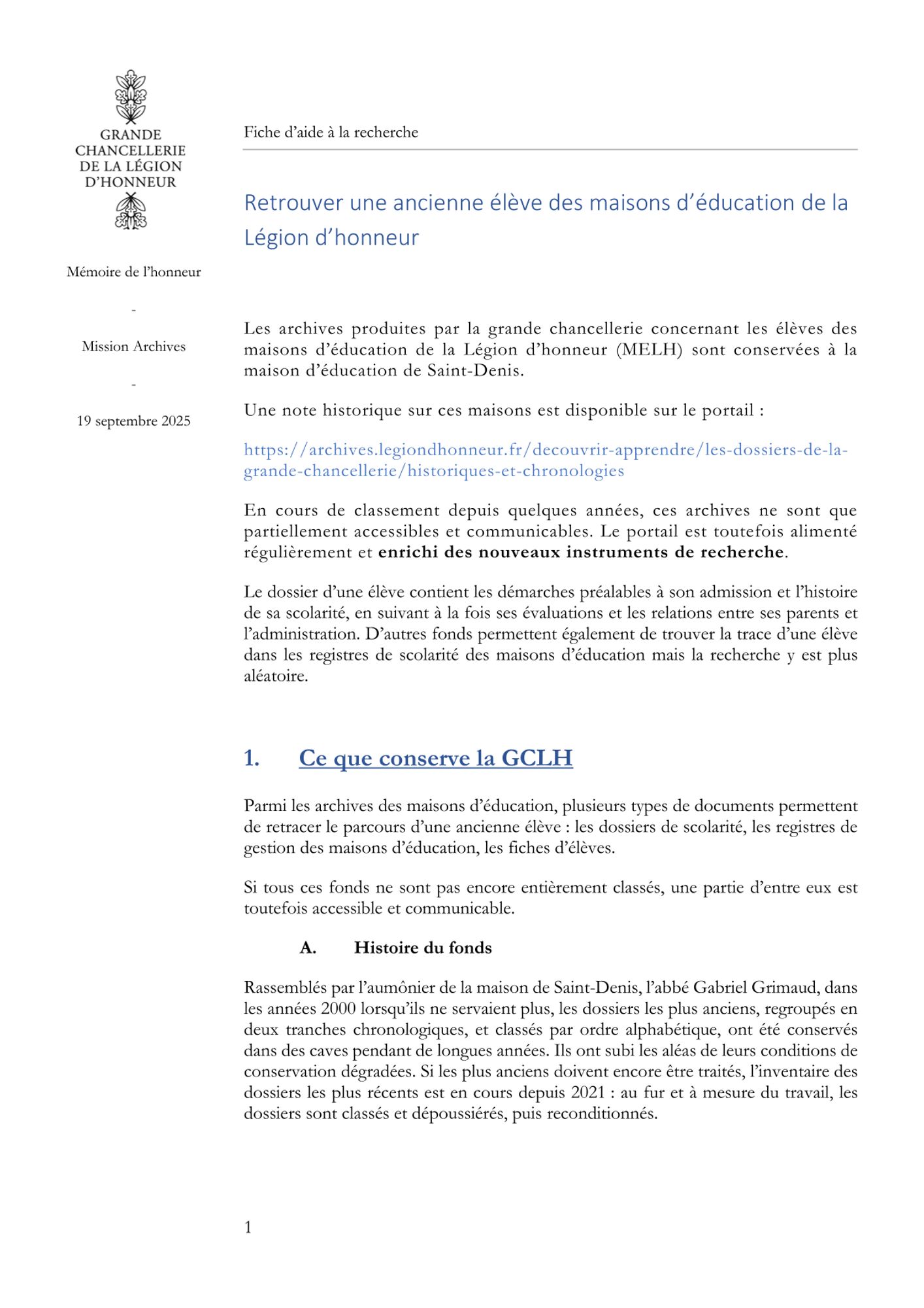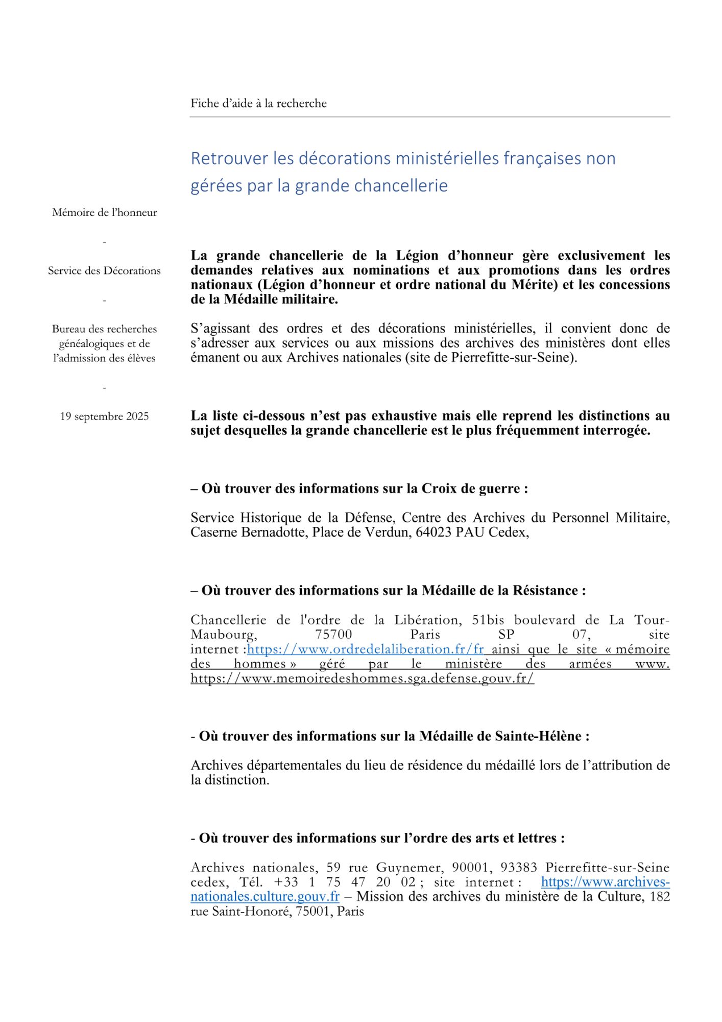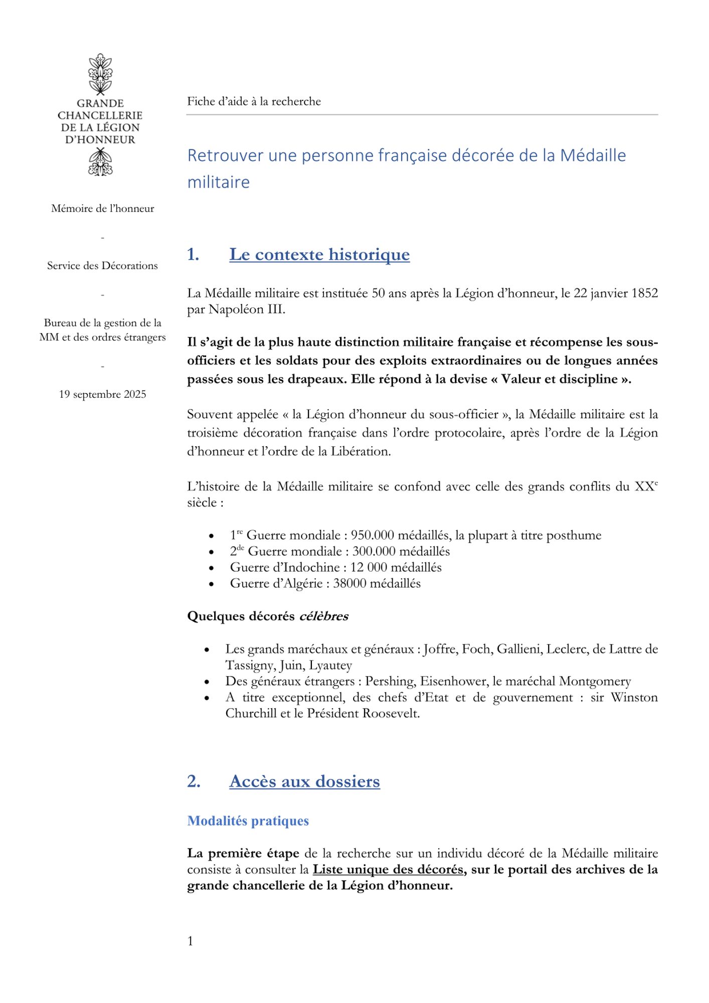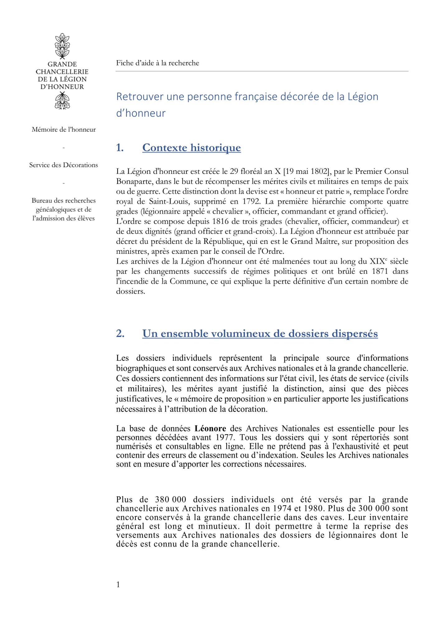 Vous trouverez ci-dessous neuf fiches d'aide à la recherche par types de sujet et ensemble d'archives : les décorations gérées par la grande chancellerie de la Légion d'honneur, la liste unique des décorées, les archives relatives aux élèves des maisons d'éducation de la Légion d'honneur et aux anciens membres du personnel.