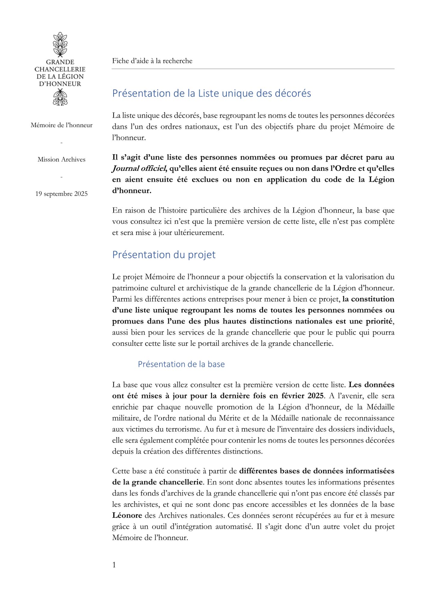 La constitution d’une liste unique des décorés est un objectif prioritaire du projet Mémoire de l’Honneur mené par la grande chancellerie de la Légion d’honneur depuis 5 ans. Il s'agit de la liste nominative de tous les décorés, c’est-à-dire de toutes les personnes nommées ou promues par décret dans la Légion d'honneur, la Médaille militaire, l’ordre national du Mérite et la Médaille nationale de reconnaissance aux victimes du terrorisme, vivants et décédés.