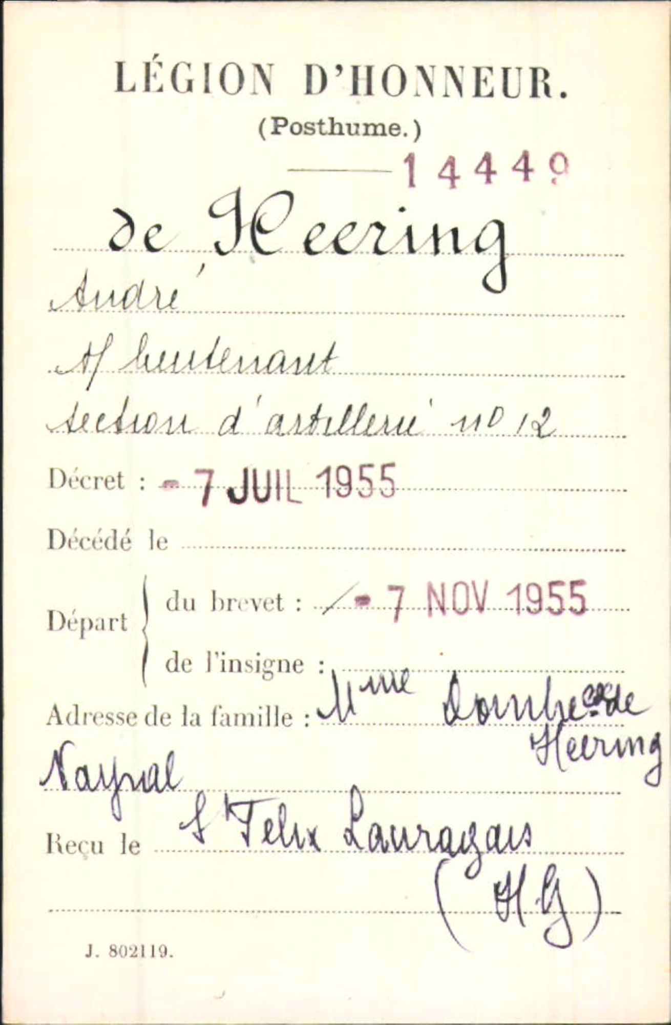 | Légion d'honneur | Chevalier | 07/07/1955 | s/ lieutenant séction d'artillerie n°12 |