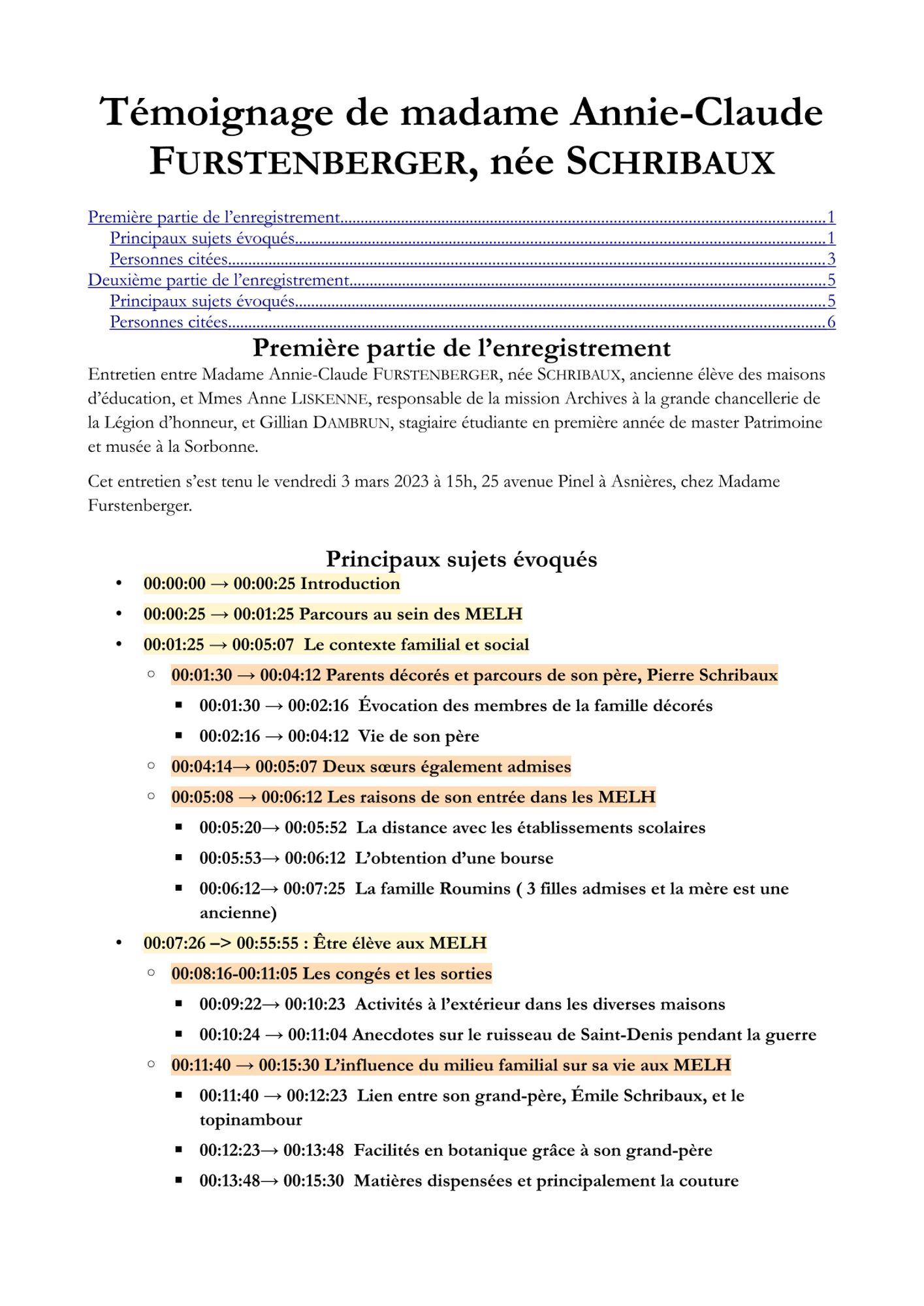 Entretiens entre Madame Annie-Claude FURSTENBERGER, née SCHRIBAUX, ancienne élève des maisons d’éducation, et Mesdames Anne LISKENNE, responsable de la mission Archives à la grande chancellerie de la Légion d’honneur, et Gillian DAMBRUN, stagiaire étudiante en première année de master Patrimoine et musée à la Sorbonne, enregistrés à Asnières les 3 et 30 mars 2023